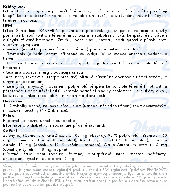 Liftea Štíhlá linie Synefrin je unikátní přípravek, jehož jednotlivé účinné složky pomáhají k lepší kontrole tělesné hmotnosti a metabolismu tuků, ke správnému trávení a úbytku tělesné hmotnosti.
