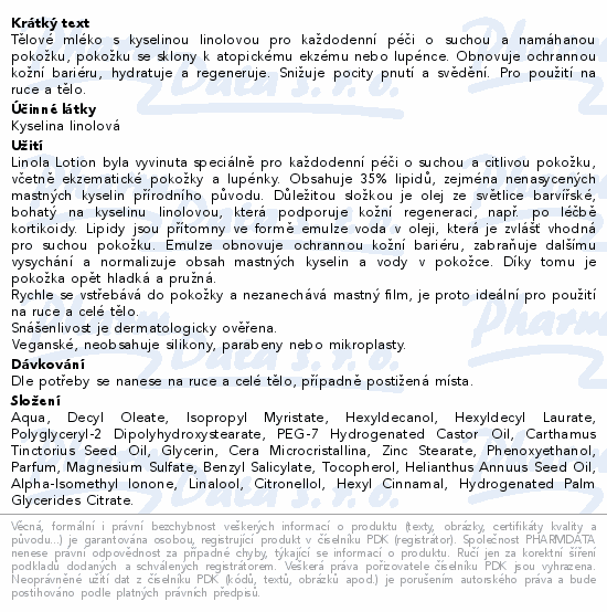 Tělové mléko s kyselinou linolovou pro každodenní péči o suchou a namáhanou pokožku, pokožku se sklony k atopickému ekzému nebo lupénce. Obnovuje ochrannou kožní bariéru, hydratuje a regeneruje. Snižuje pocity pnutí a svědění. Pro použití na ruce a tělo.