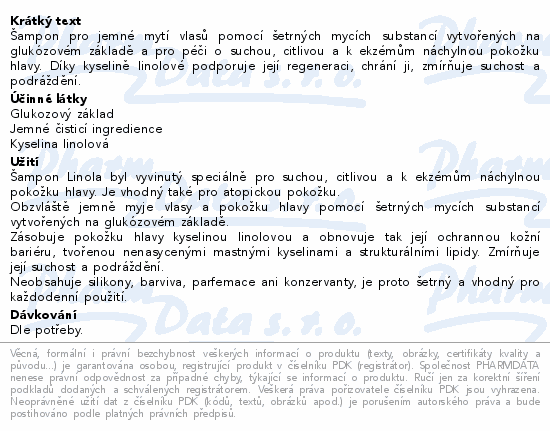 Šampon pro jemné mytí vlasů pomocí šetrných mycích substancí vytvořených na glukózovém základě a pro péči o suchou, citlivou a k ekzémům náchylnou pokožku hlavy. Díky kyselině linolové podporuje její regeneraci, chrání ji, zmírňuje suchost a podráždění.