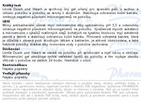 Linola Dusch und Wasch je sprchový čirý gel určený pro speciální péči o suchou a citlivou pokožku a pokožku se sklony k ekzémům. Stabilizuje ochrannou kožní bariéru, omezuje negativní působení mikroorganismů na pokožku.