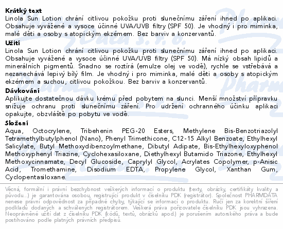 Linola Sun Lotion chrání citlivou pokožku proti slunečnímu záření ihned po aplikaci. Obsahuje vyvážené a vysoce účinné UVA/UVB filtry (SPF 50). Je vhodný i pro miminka, malé děti a osoby s atopickým ekzémem. Bez barviv a konzervantů.