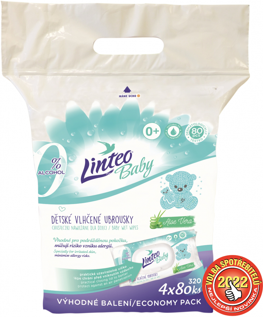 Dětské vlhčené ubrousky Linteo Baby ve výhodném balení 4x80 kusů, napuštěné pečujícím mlékem s výtažky z aloe vera. Jsou ideální pro jemnou a šetrnou očistu pokožky vašeho děťátka. Udržují přirozené pH pokožky. 0 % alkoholu, dermatologicky testované.