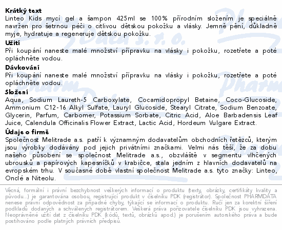 Linteo Kids mycí gel a šampon 425ml se 100% přírodním složením je speciálně navržen pro šetrnou péči o citlivou dětskou pokožku a vlásky. Jemně pění, důkladně myje, hydratuje a regeneruje dětskou pokožku.