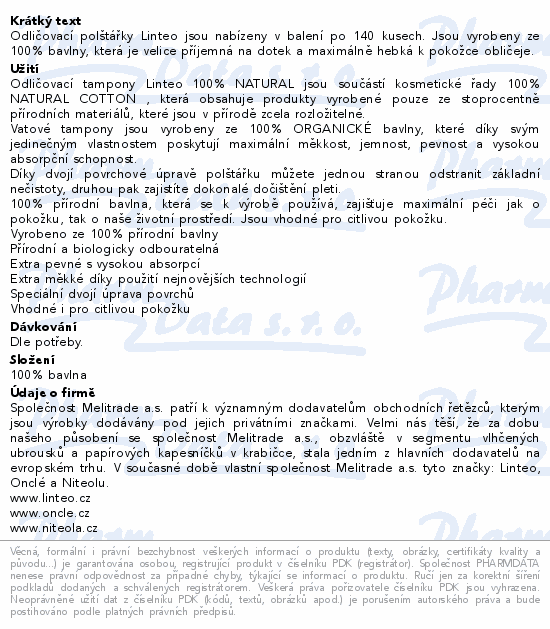 Odličovací polštářky Linteo jsou nabízeny v balení po 140 kusech. Jsou vyrobeny ze 100% bavlny, která je velice příjemná na dotek a maximálně hebká k pokožce obličeje.