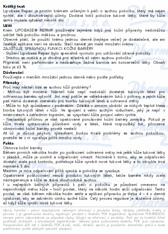 Lipobase Repair je prvním krémem určeným k péči o suchou pokožku, který má nejen rychlé, ale i dlouhotrvající účinky. Dodává totiž pokožce tukové látky, které by kůže sama musela vytvářet několik dní.