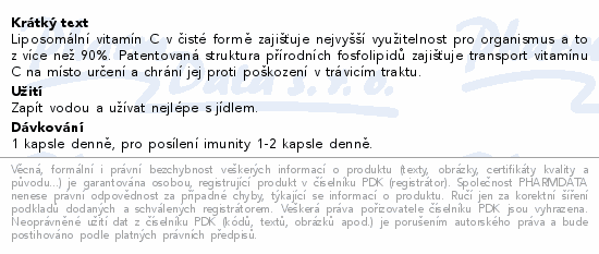 Liposomální vitamín C v čisté formě zajišťuje nejvyšší využitelnost pro organismus a to z více než 90%. Patentovaná struktura přírodních fosfolipidů zajišťuje transport vitamínu C na místo určení a chrání jej proti poškození v trávicím traktu.