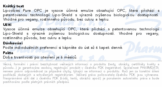 Lipovibes Pure OPC je vysoce účinná emulze obsahující OPC, která přichází s patentovanou technologií Lipo-Shield s výrazně zvýšenou biologickou dostupností. Vhodné pro vegany, rostlinného původu, bez cukru a lepku.