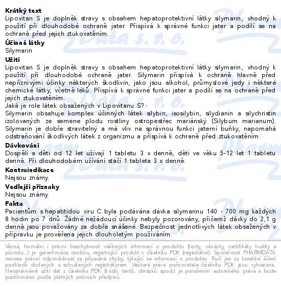 Lipovitan S je doplněk stravy s obsahem hepatoprotektivní látky silymarin, vhodný k použití při dlouhodobé ochraně jater. Přispívá k správné funkci jater a podílí se na ochraně před jejich ztukovatěním.