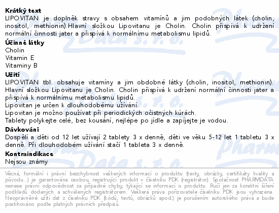 LIPOVITAN je doplněk stravy s obsahem vitamínů a jim podobných látek (cholin, inositol, methionin).Hlavní složkou Lipovitanu je Cholin. Cholin přispívá k udržení normální činnosti jater a přispívá k normálnímu metabolismu lipidů.