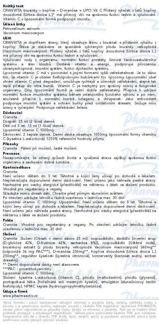 CRANVITA brusinky – kopřiva – D-manósa + LIPO Vit C Přidaný výtažek z listů kopřivy dvoudomé (Urtica dioica L.)* má příznivý vliv na správnou funkci ledvin a vylučování. Vitamín C v lipozomální formě podporuje imunitu.