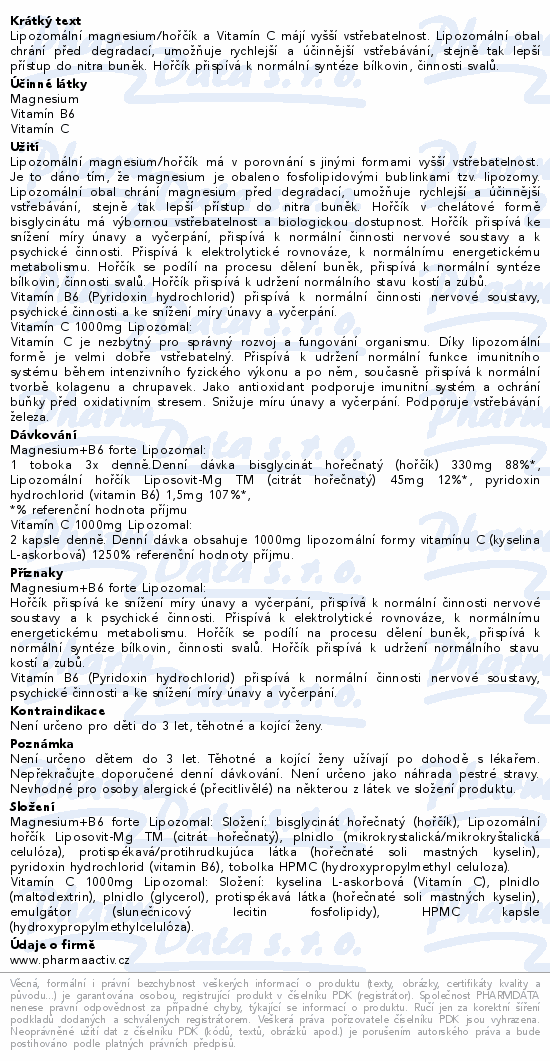 Lipozomální magnesium/hořčík a Vitamín C májí vyšší vstřebatelnost. Lipozomální obal chrání před degradací, umožňuje rychlejší a účinnější vstřebávání, stejně tak lepší přístup do nitra buněk. Hořčík přispívá k normální syntéze bílkovin, činnosti svalů.