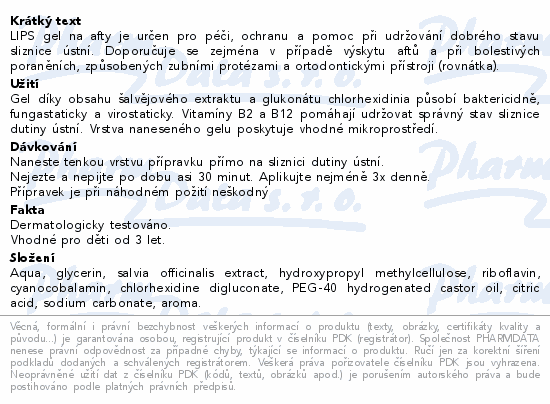 LIPS gel na afty je určen pro péči, ochranu a pomoc při udržování dobrého stavu sliznice ústní. Doporučuje se zejména v případě výskytu aftů a při bolestivých poraněních, způsobených zubními protézami a ortodontickými přístroji (rovnátka).