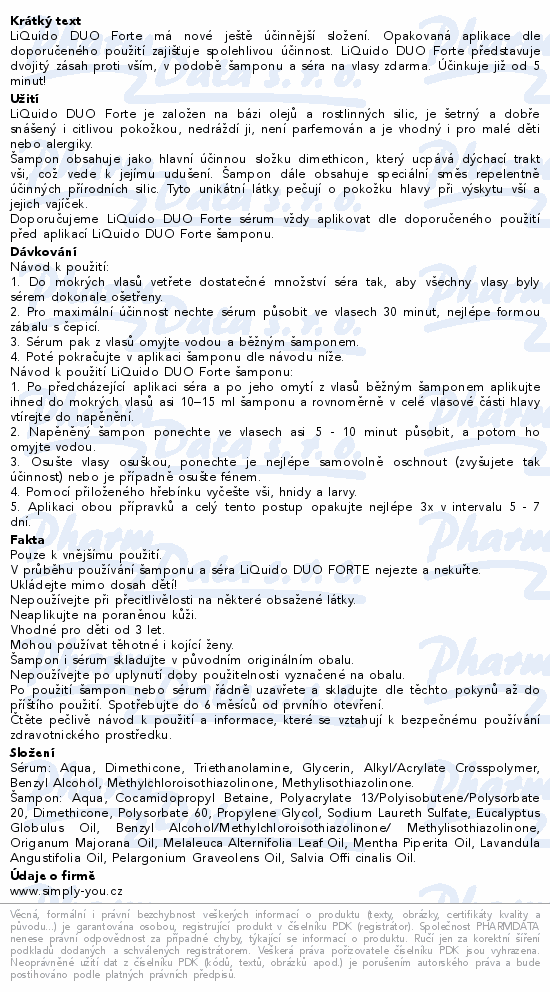 LiQuido DUO Forte má nové ještě účinnější složení. Opakovaná aplikace dle doporučeného použití zajišťuje spolehlivou účinnost. LiQuido DUO Forte představuje dvojitý zásah proti vším, v podobě šamponu a séra na vlasy zdarma. Účinkuje již od 5 minut!