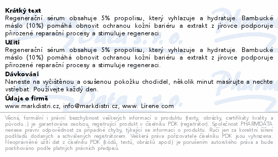 Regenerační sérum obsahuje 5% propolisu, který vyhlazuje a hydratuje. Bambucké máslo (10%) pomáhá obnovit ochranou kožní bariéru a extrakt z jírovce podporuje přirozené reparační procesy a stimuluje regeneraci.