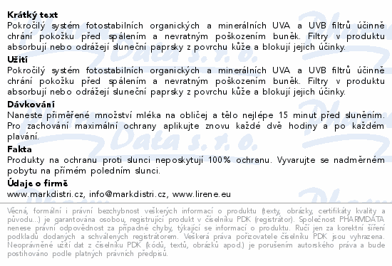 Lirene opalovací mléko děti SPF50+ 150ml