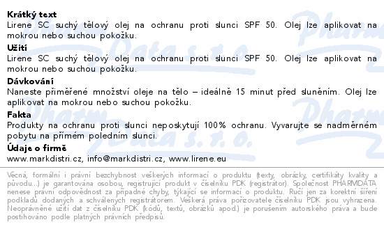 Lirene SC suchý tělový olej na ochranu proti slunci SPF 50. Olej lze aplikovat na mokrou nebo suchou pokožku.