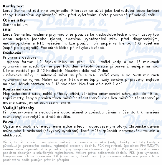 Leros Senna list rostlinné projímadlo. Přípravek se užívá jako krátkodobá léčba funkční zácpy, k akutnímu vyprázdnění střev před vyšetřením. Čtěte pozorně příbalový leták.