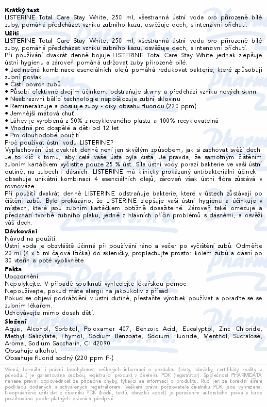 LISTERINE Total Care Stay White, 250 ml, všestranná ústní voda pro přirozeně bílé zuby, pomáhá předcházet vzniku zubního kazu, osvěžuje dech, s intenzivní příchutí.