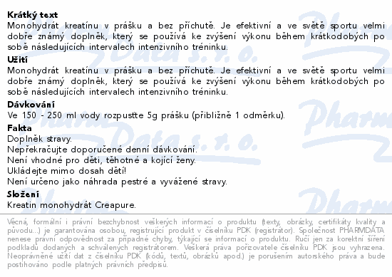 Monohydrát kreatínu v prášku a bez příchutě. Je efektivní a ve světě sportu velmi dobře známý doplněk, který se používá ke zvýšení výkonu během krátkodobých po sobě následujících intervalech intenzivního tréninku.