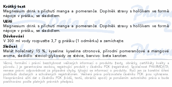 Magnesium drink s příchutí manga a pomeranče. Doplněk stravy s hořčíkem ve formě nápoje v prášku, se sladidlem.