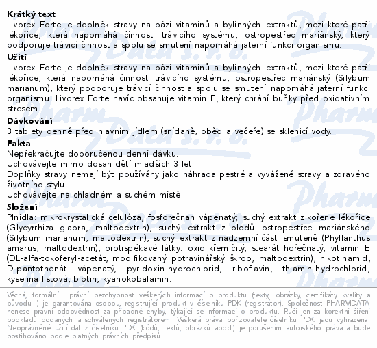 Livorex Forte je doplněk stravy na bázi vitaminů a bylinných extraktů, mezi které patří lékořice, která napomáhá činnosti trávicího systému, ostropestřec mariánský, který podporuje trávicí činnost a spolu se smutení napomáhá jaterní funkci organismu.