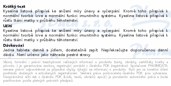 Kyselina listová přispívá ke snížení míry únavy a vyčerpání. Kromě toho přispívá k normální tvorbě krve a normální funkci imunitního systému. Kyselina listová přispívá k růstu tkání matky v průběhu těhotenství.