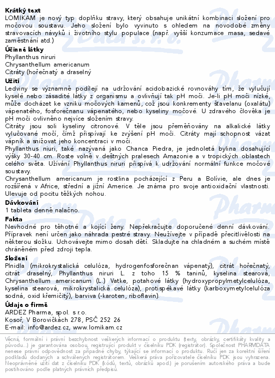 LOMIKAM je nový typ doplňku stravy, který obsahuje unikátní kombinaci složení pro močovou soustavu. Jeho složení bylo vyvinuto s ohledem na novodobé změny stravovacích návyků i životního stylu populace (např. vyšší konzumace masa, sedavé zaměstnání atd.)