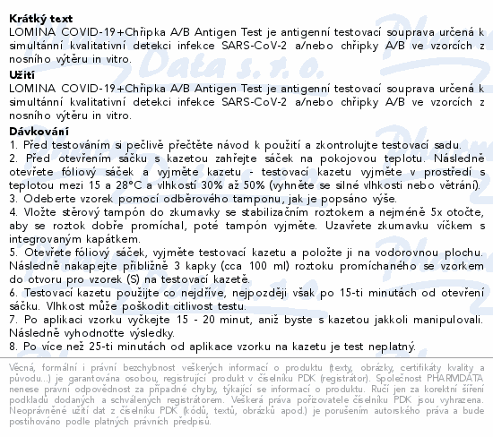 LOMINA COVID-19+Chřipka A/B Antigen Test je antigenní testovací souprava určená k simultánní kvalitativní detekci infekce SARS-CoV-2 a/nebo chřipky A/B ve vzorcích z nosního výtěru in vitro.