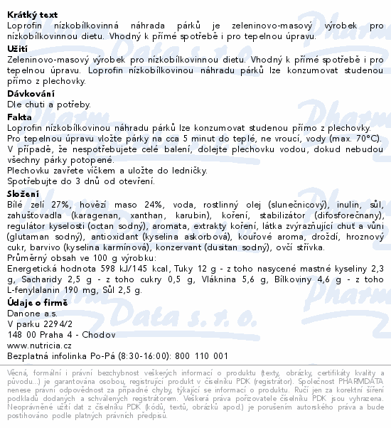 Loprofin nízkobílkovinná náhrada párků je zeleninovo-masový výrobek pro nízkobílkovinnou dietu. Vhodný k přímé spotřebě i pro tepelnou úpravu.