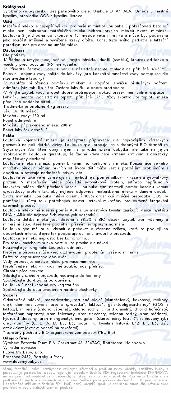 Vyrobeno ve Švýcarsku. Bez palmového oleje. Osahuje DHA*, ALA, Omega 3 mastné kyseliny, prebiotika GOS a kyselinu listovou.