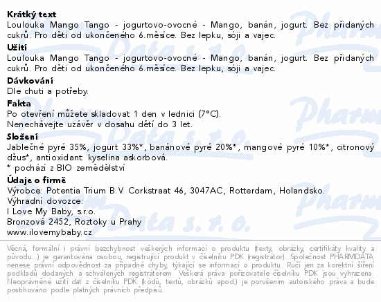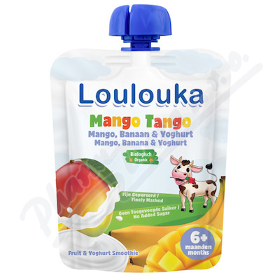Loulouka Mango Tango - jogurtovo-ovocné - Mango, banán, jogurt. Bez přidaných cukrů. Pro děti od ukončeného 6.měsíce. Bez lepku, sóji a vajec.