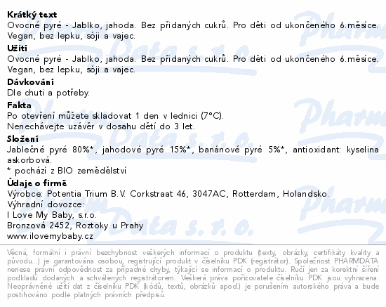 Ovocné pyré - Jablko, jahoda. Bez přidaných cukrů. Pro děti od ukončeného 6.měsíce. Vegan, bez lepku, sóji a vajec.