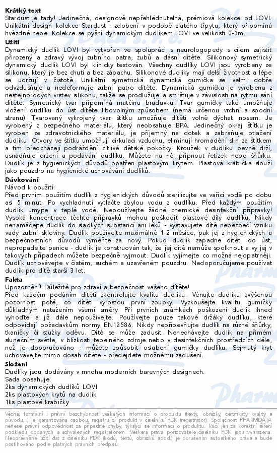 Stardust je tady! Jedinečná, designově nepřehlédnutelná, prémiová kolekce od LOVI. Unikátní design kolekce Stardust - zdobení v podobě zlatého třpytu, který připomíná hvězdné nebe. Kolekce se pyšní dynamickým dudlíkem LOVI ve velikosti 0-3m.