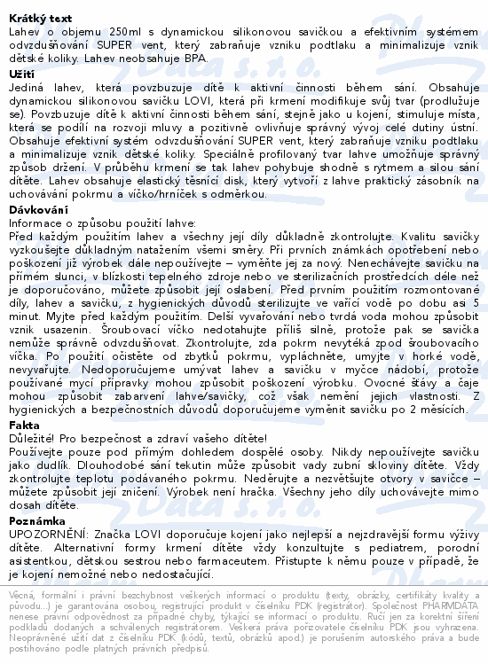 Lahev o objemu 250ml s dynamickou silikonovou savičkou a efektivním systémem odvzdušňování SUPER vent, který zabraňuje vzniku podtlaku a minimalizuje vznik dětské koliky. Lahev neobsahuje BPA.