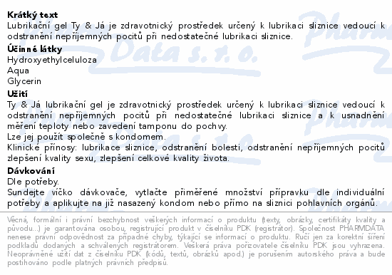 Lubrikační gel Ty & Já je zdravotnický prostředek určený k lubrikaci sliznice vedoucí k odstranění nepříjemných pocitů při nedostatečné lubrikaci sliznice.