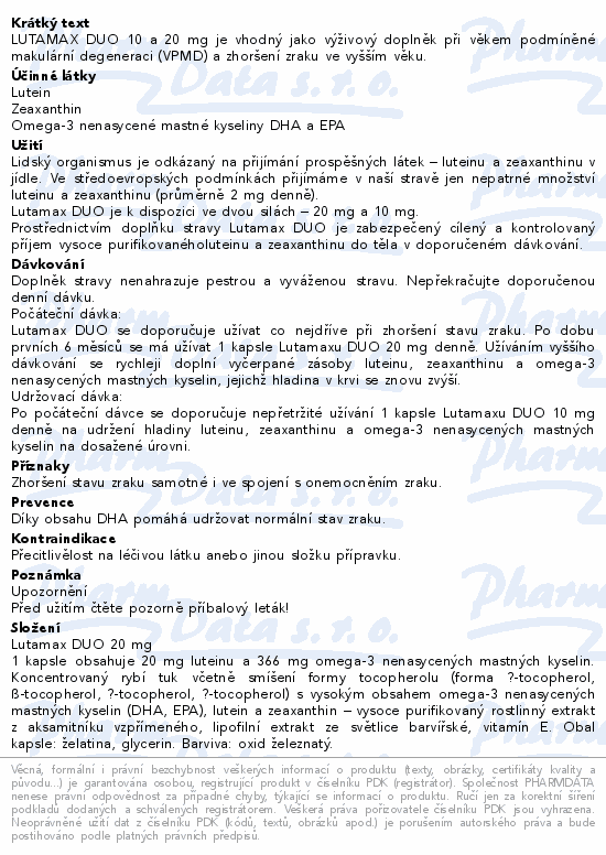 LUTAMAX DUO 10 a 20 mg je vhodný jako výživový doplněk při věkem podmíněné makulární degeneraci (VPMD) a zhoršení zraku ve vyšším věku.