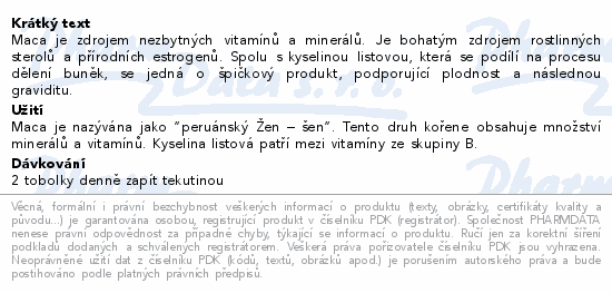 Maca je zdrojem nezbytných vitamínů a minerálů. Je bohatým zdrojem rostlinných sterolů a přírodních estrogenů. Spolu s kyselinou listovou, která se podílí na procesu dělení buněk, se jedná o špičkový produkt, podporující plodnost a následnou graviditu.