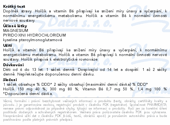 Doplněk stravy. Hořčík a vitamín B6 přispívají ke snížení míry únavy a vyčerpání, k normálnímu energetickému metabolismu. Hořčík a vitamín B6 k normální činnosti nervové soustavy.