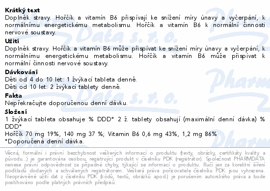 Doplněk stravy. Hořčík a vitamín B6 přispívají ke snížení míry únavy a vyčerpání, k normálnímu energetickému metabolismu. Hořčík a vitamín B6 k normální činnosti nervové soustavy.