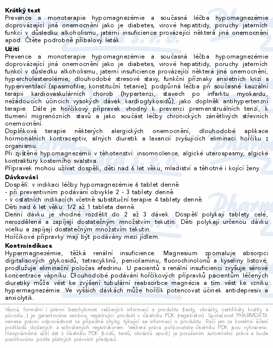 Prevence a monoterapie hypomagnezémie a současná léčba hypomagnezémie doprovázející jiná onemocnění jako je diabetes, virové hepatitidy, poruchy jaterních funkcí v důsledku alkoholismu, jaterní insuficience provázející některá jiná onemocnění apod. Čtěte pozorně příbalový leták.