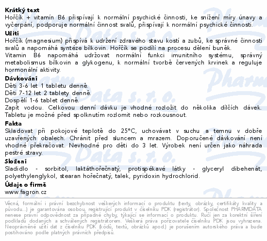 Hořčík + vitamín B6 přispívají k normální psychické činnosti, ke snížení míry únavy a vyčerpání, podporuje normální činnost svalů, přispívají k normální psychické činnosti.