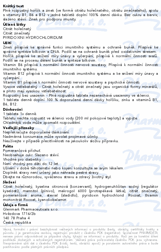 Plně rozpustný hořčík a zinek (ve formě citrátu hořečnatého, citrátu zinečnatého), spolu s vitaminy B1, B6 a B12 v jedné tabletě doplní 100% denní dávku. Bez cukru a barviv, slazeno stévií. Zinek pro podporu imunity.