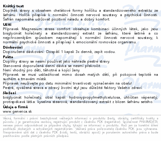 Doplněk stravy s obsahem chelátové formy hořčíku a standardizovaného extraktu ze šafránu. Hořčík přispívá k normální činnosti nervové soustavy a psychické činnosti. Šafrán napomáhá udržovat pozitivní náladu a dobrý komfort.
