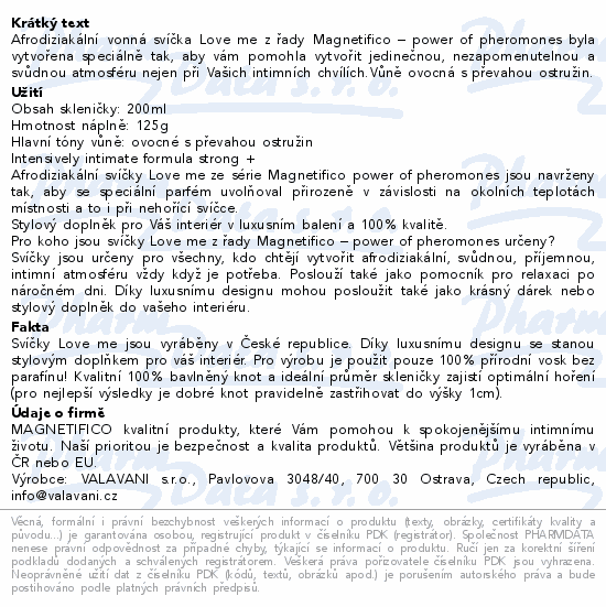 Afrodiziakální vonná svíčka Love me z řady Magnetifico – power of pheromones byla vytvořena speciálně tak, aby vám pomohla vytvořit jedinečnou, nezapomenutelnou a svůdnou atmosféru nejen při Vašich intimních chvílích.Vůně ovocná s převahou ostružin.