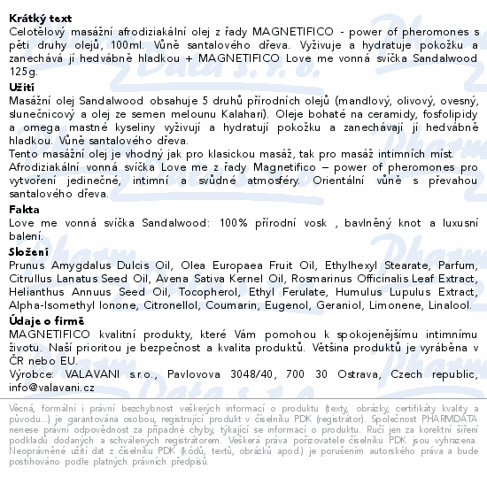 Celotělový masážní afrodiziakální olej z řady MAGNETIFICO - power of pheromones s pěti druhy olejů, 100ml. Vůně santalového dřeva. Vyživuje a hydratuje pokožku a zanechává jí hedvábně hladkou + MAGNETIFICO Love me vonná svíčka Sandalwood 125g.