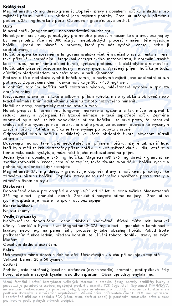 Magnetrans® 375 mg direct-granulát Doplněk stravy s obsahem hořčíku a sladidla pro zajištění přisunu hořčíku v období jeho zvýšené potřeby. Granulát určený k přímému podání s 375 mg hořčíku v porci. Citronovo - grapefruitová příchuť.