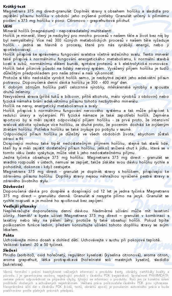 Magnetrans 375 mg direct-granulát Doplněk stravy s obsahem hořčíku a sladidla pro zajištění přisunu hořčíku v období jeho zvýšené potřeby Granulát určený k přímému podání s 375 mg hořčíku v porci. Citronovo - grapefruitová příchuť.