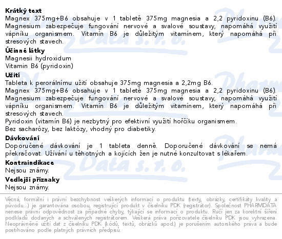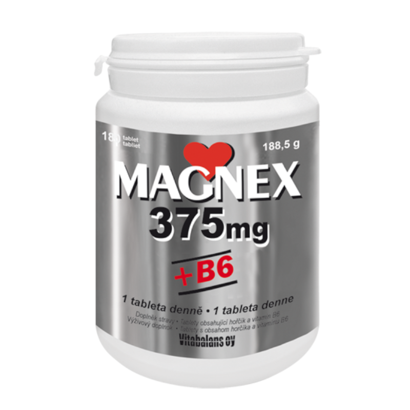 Magnex 375mg+B6 obsahuje v 1 tabletě 375mg magnesia a 2,2 pyridoxinu (B6). Magnesium zabezpečuje fungování nervové a svalové soustavy, napomáhá využití vápníku organismem. Vitamín B6 je důležitým vitamínem, který napomáhá při stresových stavech.