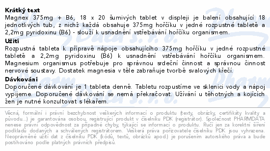 Magnex 375mg + B6, 18 x 20 šumivých tablet v displeji je balení obsahující 18 jednotlivých tub, z nichž každá obsahuje 375mg hořčíku v jedné rozpustné tabletě a 2,2mg pyridoxinu (B6) - slouží k usnadnění vstřebávání hořčíku organismem.