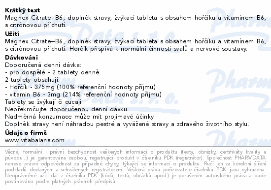 Magnex Citrate+B6, doplněk stravy, žvýkací tableta s obsahem hořčíku a vitamínem B6, s citrónovou příchutí.
